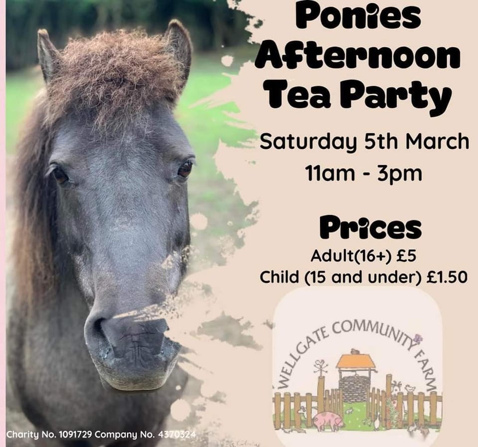 Wellgate Community Farm would like to invite you to their Ponies Afternoon Tea Party between the hours of 11am and 3pm on Saturday 5th March 🫖 🐴